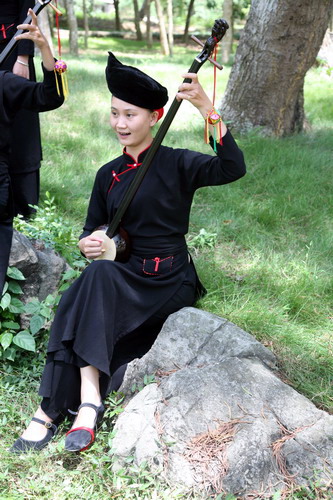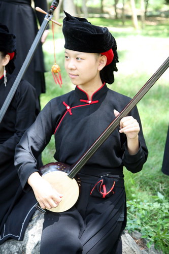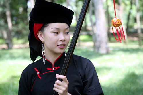 天琴,是壮族三大乐器中最古老的乐器之一,已有上千年历史,壮话称为“鼎叮”,用葫芦制作,由琴筒、琴杆、琴轴、琴弦、琴马等部件组成,音域宽,音色清亮、圆润、甜美悦耳。它是广西龙州、宁明、凭祥、防城巷一带壮民进行祭祀、说唱及日常文化娱乐活动必不可少的乐器。