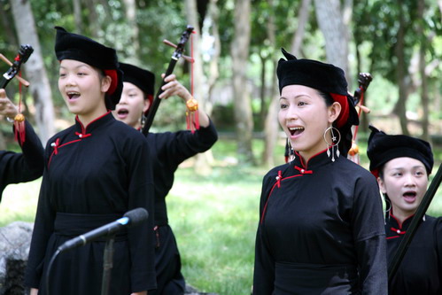 2003年11月8日,在南宁国际民歌艺术节“东南亚风情夜”晚会上,龙州天琴女子弹唱组合,手抱天琴,脚摇铃铛,边弹边唱,一首天琴弹唱《唱天谣》唱响了流传千年的古老歌谣音乐。铃声与琴声合鸣,美人和古琴合一,营造出纯正美妙的“天、地、人”合一的意境。在充满着山味、野味、壮味和优美、动听、悦耳的音乐声中,将美丽的龙州壮乡山美、水美、歌美、人美和浓郁的民族风情带给观众,赢得了观众阵阵喝彩。随后龙州天琴组合一路唱到了北京,唱响了中国。
