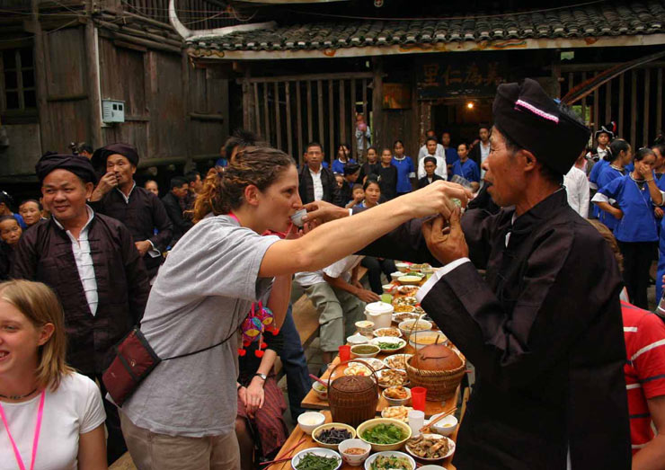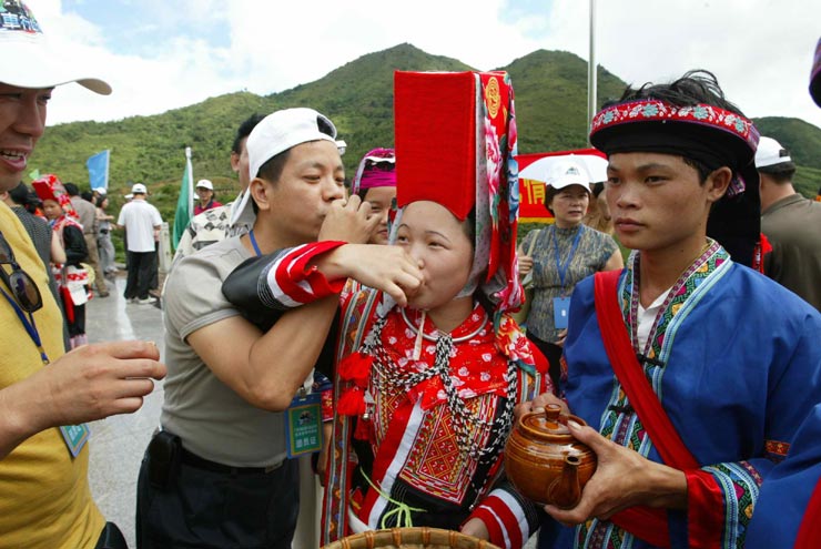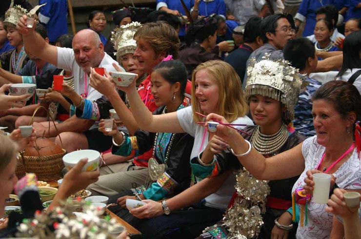 防城港市高林村的瑶族同胞向远到而来的汉族游客敬酒
