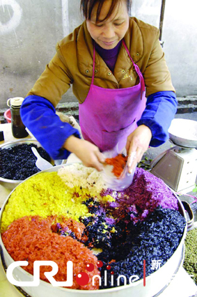 而红染料、紫染料其实是用同一品种、但叶子形状不同的红兰草经水煮而成。壮族村民黄晓女士介绍说:“叶片稍长点的红兰草,颜色稍深,煮出来的颜色较浓,泡出来的米就成了紫色;叶片较圆,颜色较浅,煮出来的颜色较淡,泡出来的米即成鲜红色。”