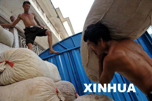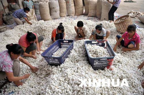 9月19日,在广西河池宜州市龙江茧丝有限公司,工人忙着分捡蚕茧。