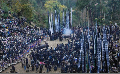 牛,猪宰杀完毕,牛头砍下,在杀牛场中央摆成长排,以此祭祀祖先,每户人家煮熟一块猪肉,拿到村中一所小木房祭供,这所小木房便是该村人祖先神圣的灵堂。这里的习俗非常特别,逢年过节,从不烧香,化纸钱,人死后也不留坟墓,但对燃放鞭炮特感兴趣,节日3天鞭炮声从未间隔过。