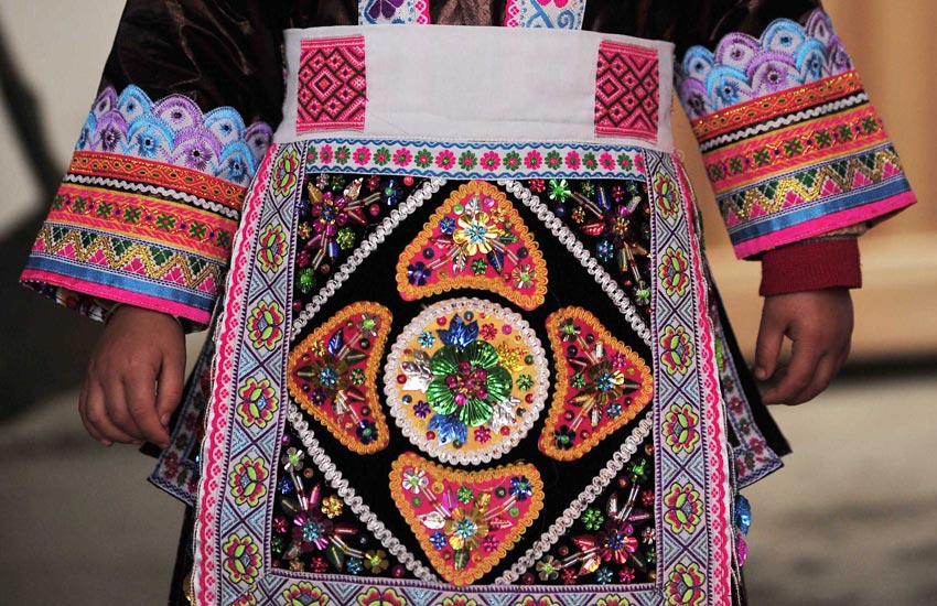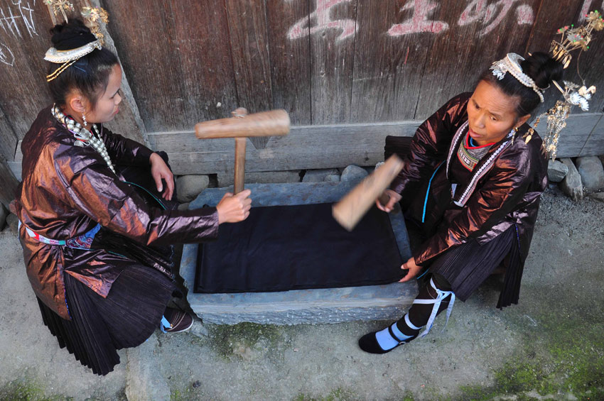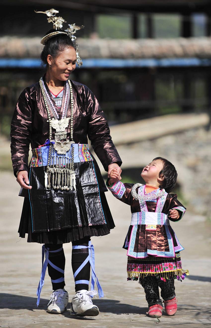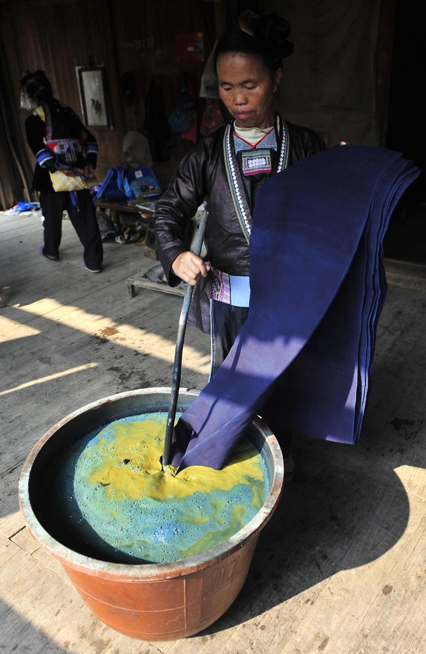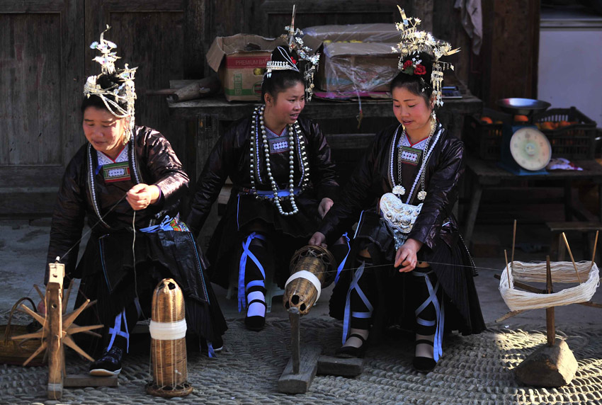贵州省黎平县铜关侗族村寨至今仍保持着手工制作侗族服装的传统。侗族服装的制作过程漫长而繁杂,从棉花的种植、收获到一件精美的成衣,要经过纺纱织布、浸染、刺绣等上百个步骤和长达一两年的时间才能完成。