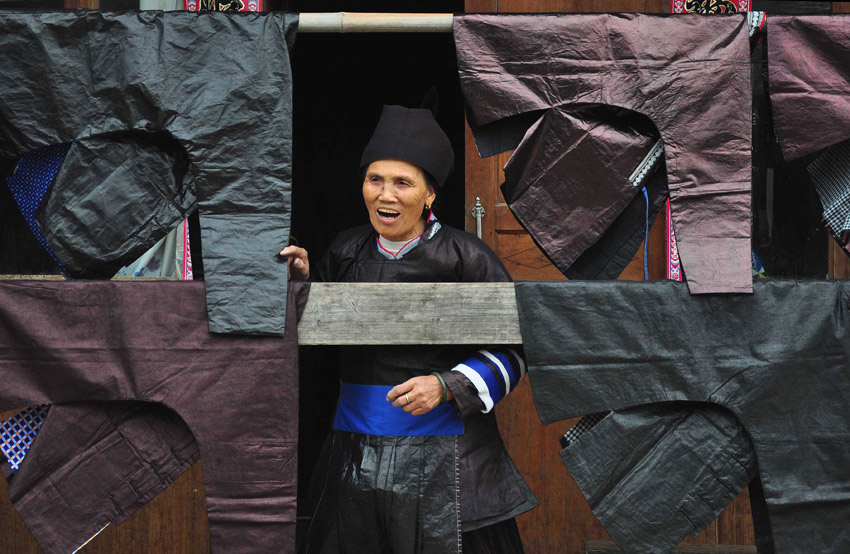 在贵州省黎平县铜关村,一位侗族老人晾晒她制作的侗族服装。
