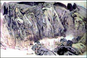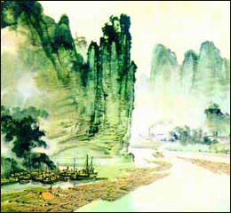 提到黄格胜,就想到了他的《漓江百里图》。作者把漓江百里的美景及迷人的形态情调贯通于长卷,统一布局,分段表现;既能独立成幅,又贯通全卷:“漓 江烟雨,渔家灯火,千峰碧透,浮山倒影”,在200米的长卷中,表现得美不胜收。用笔雄劲潇洒,讲究清新与朦胧相配,达到“能卧游,可展赏”的艺术效果。