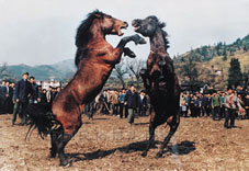斗马场地一般都设在村寨间较宽广的平地上。每逢斗马节、便人山人海,锣鼓喧天,芦笙阵阵,彩旗飘舞,热闹非凡。中午时分,一支支斗马队在乐曲声中向斗马场汇集。当元老(大会主持者)宣布斗马开始后,首先由一个身着苗族服装的后生(年轻人)牵着一匹母马进场中心,接着有两个后生各牵着自己的斗马,分别从场两端入场。当他俩一扬鞭放手,两只斗马便为占有和保护那匹母马而扬鬃长啸,向对方冲去展开搏斗,此时此刻、斗马场欢声雷动,烟尘滚滚,猛烈惊险、扣人心弦。你看那两马时而奋蹄直追,疾如闪电;时而咬成一团,难解难分;时而扬蹄嚎叫,企图慑报对手。经一番苦斗,输者狂奔逃窜,赢者则奋蹄直追。在观众一片热烈的掌声和喝彩声中,由元老当场给夺冠的斗马戴上大红花,人们也纷纷涌来同斗马主人握手、拥抱,鸣放鞭炮,以表示热烈的祝贺。