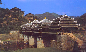 程阳永济桥是侗族地区规模最大的风雨桥,该桥始建于1912年,成于1924年。桥面长77.76米,桥台近距64.70米,河面至桥亭高20.25米,有五墩四孔。由于技艺的高超,全桥不用一钉一铆。桥分两层、楼阁五个,阁高二丈。楼阁造型,有两座是五层四角塔形楼亭,两座是五层殿形楼亭,分布在桥的两端,互为对衬,中间一座是六角塔形楼阁。在五个楼阁之间的跨桥上面,盖上青瓦衔接,使整座大桥从上到下,浑然一体,重瓴联阁,雄伟壮观。由于楼阁亭檐巧妙地运用了杠杆原理,采用方吊柱形式,使亭檐婷婷而上,势态如飞,令人神往。尤其令人赞叹的是,桥墩之间跨度很大,侗家的能工巧匠们,就在这桥墩上面铺两层下短上长的连排大杉木为挑梁(又叫挑枕)而把两层正梁架在挑梁之上。由于有桥墩为支点,以挑梁为杠杆,从而缩短了跨度,减少了挠度同时又把桥亭竖在两排正梁接头处,使其起到重力平衡作用。因此,负重近二十斤的正梁始终稳固平衡。桥亭、楼阁、殿宇及走廊均有金扁、雕刻等待,长廊尽头又有石刻碑记,可惜这些艺术珍品已遭破坏殆尽。一九八二年程阳桥被列为全国重点文物保护单位之一。郭沫若副委员长一九六五年为阳阳桥赋诗题字,更为这座大桥生色增辉,题“程阳桥” 三字,诗为:“艳说林溪风雨桥,桥长廿丈四寻高;重瓴联阁怡神巧,列砥横流入望遥。竹木一身坚胜铁,茶林万载茁新苗。何时得上三江高,学把犁锄事体劳。” 由于程阳桥造型奇特,雄伟壮观,国内外友人到来参观、拍摄和描绘者逐年增多,中国邮政也曾印制程阳桥纪念邮票。程阳永济桥以它高超的建筑技艺和雄伟风姿扬名天下,是世界四大历史名桥之一(其他三桥为:中国石拱赵州桥、铁索沪定桥和罗马尼亚的钢梁诺娃上沃桥)。