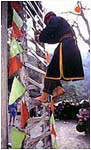 在以前,"度戒"的仪式很繁琐,有"上刀山,过火海"之说。而现在只经历"跳云台"的考验即可。所谓"云台"就是正方形的高台,以四条长木为柱,高一丈二尺或一丈八尺,各柱相距一尺五寸,上铺木板,在一边扎有横木为梯,以便攀登。接受"度戒"的瑶族小青年,在长者的带领下登上"云台",长者向他们表示美好的祝愿后小青年就蹲下闭目,手抱双膝,勇敢地从台上侧翻跳下,谓?quot;跳云台"。当小青年跳落到铺有棉絮或稻草的藤网后,在地面上等候着人们就连网把他抬起围绕"云台"走三圈,表示这位瑶族小青年已经完成了"度戒",取得成年人的资格了。这时,周围的观众热烈欢呼表示祝贺。