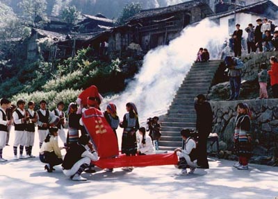这是龙胜县龙脊一带壮族结婚时背新娘的场面。桂林地区壮、汉、瑶、苗、侗等各族杂居,民族风俗多种多样,比如壮族传统歌节“三月三”时的抛绣球,侗族传统民俗节日花炮节的抢花炮等等。最有意思的是“走寨”,在有月光的晚上进行,故又称“踩月亮”。每当月明之夜,小伙子们三五成群,弹琴吹箫,走村串寨,找姑娘们对歌、闲聊。姑娘们则三三两两聚在某家木楼,纺纱织布,说说笑笑。听到小伙子走寨的琴声,说笑停止,只有纺纱车在不停地转。小伙子听到纺车知道姑娘们在等待,便轻轻地走上楼,坐在火塘边弹琴吹箫,姑娘们和唱。如果双方有意,就单独对唱,直到雄鸡三唱,东方既明。